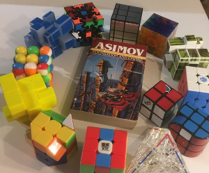 Angefangen hat alles mit einem Zauberwürfel aus dem Spielwarengeschäft. Da der sich aber verhältnismäßig schwer drehen lässt, kamen gantz schnell weitere Cubes dazu, z.B. zwei silberfarbige Mirror-Cubes, von den ich einen sichrheitshalber mal mit farbigen Markierungen (mit einem Locher ausgestanztes farbiges Papier und mit Tesafilm befestigt) versehen habe - inzwischen brauche ich das nicht mehr - , sowie einigen Speed-Cubes, z. B.einen Weilong-Cube, einen "Monster Go Cube" einen "GAN 356 XS"), einen molekularen Cube mit kugelförmigen "Cubies", einen "ShengShou Gem 3x3x3", einen 4x4x4, einen "LVHERO Carbon-Sticker-Cube", einen "QiYA Mirror Cube blue", einen Camouflage Magic Mirror Cube, einen knallgrünen und leuchtenden zitronengelben Magic Mirror Cube, einen "kubischen Globus-Mirror Cube", einen Fisher-Cube, einen 2x2-Rubiks-Würfel, drei Penrose-Cubes, einen "QiYi Clover Pyraminx", drei Pyraminxes (einen in Normalfarben, zwei kristallene mit dünnen Farbrändern), einen wirklich gut drehbaren (leichten!) Gear Cube, einen völlig undrehbaren Gear Pyraminx, einen Rubiks Phantom, der schwarz ist und erst beim Drehen durch die Handwärme so langsam seine Farbflächen anzeigt ... undsoweiter undsofort... jede Menge Schnickschnack, die man als Geek für seine seelische Gesundheit so braucht :-)